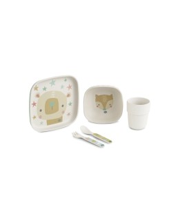 Disfruta de las primeras comidas con tu bebé y observa como poco a poco va descubriendo nuevos alimentos y texturas y siendo más autónomo a la hora de comer gracias a nuestra vajilla elaborada en melamina. · Incluye: 1 bol, 1 plato llano, 1 cuchara, 1 tenedor y 1 vaso. · Todos los componentes están realizados con materiales de alta calidad y libres de BPA. · Vajilla apta para microondas y lavavajillas.