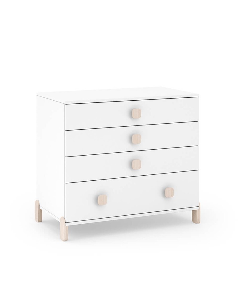 Una preciosa cómoda con tiradores y patas en madera natural (o ruedas).