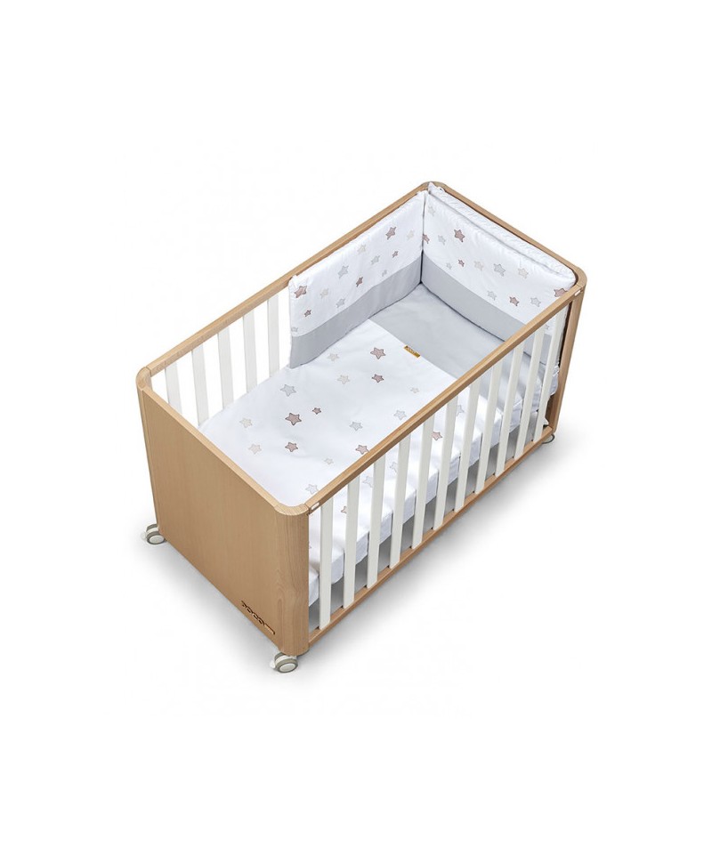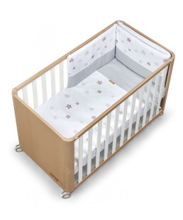 Cuna de colecho en madera natural y barrotes en blanco con colchón y textiles