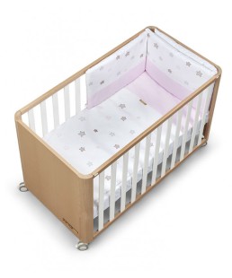 Cuna de colecho en madera natural y barrotes en blanco con colchón y textiles