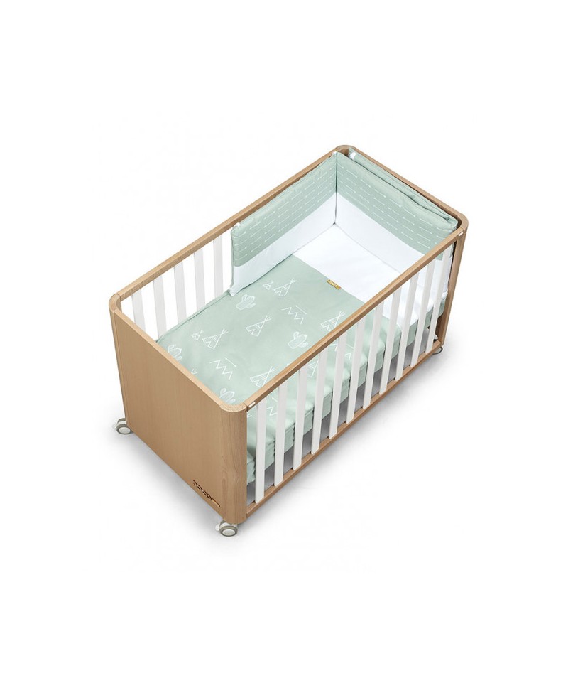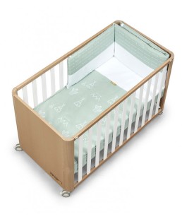 Cuna de colecho en madera natural y barrotes en blanco con colchón y textiles
