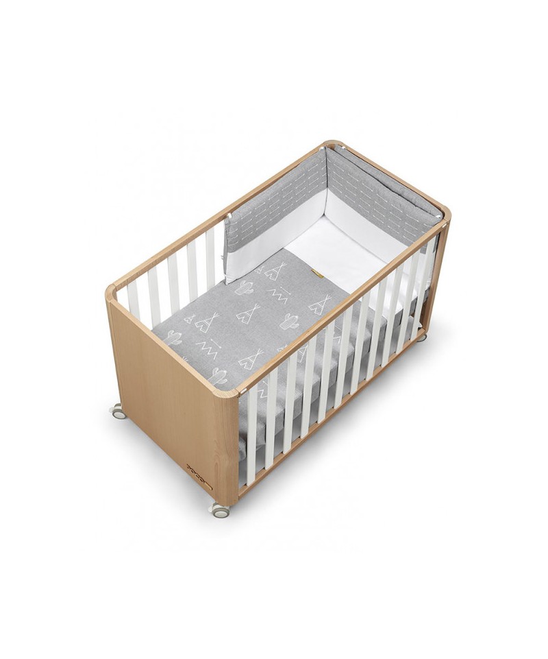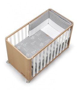 Cuna de colecho en madera natural y barrotes en blanco con colchón y textiles