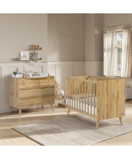 Inspirada en un estilo natural y fabricada con maderas procedentes de bosques sostenibles, la colección Martha está compuesta por cuna, armario, bañera y cómoda a la que le puedes añadir su cambiador.
