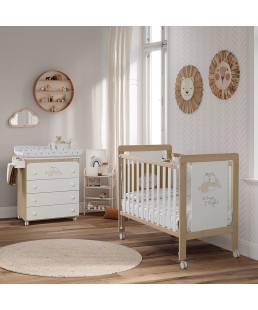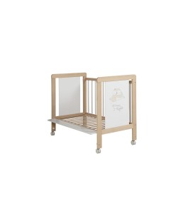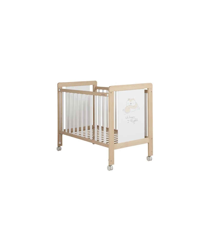 La cuna Happy de 120 x 60 cm está disponible en color blanco y blanco-waterwood, y tiene su textil opcional a juego, 100% algodón.