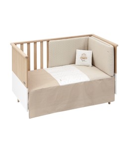 Juego de 2 piezas para vestir la cuna, compuesto por colcha invierno/verano más protector incluye un bonito cojín bordado. La colcha, es la prenda que viste la cuna y cumple el cometido de protección contra el frío como si de una manta o una funda nórdica se tratara.