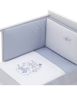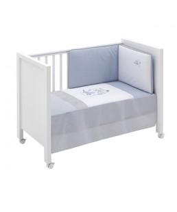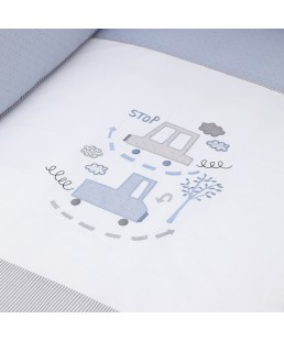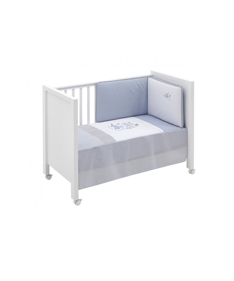 Juego de 2 piezas para vestir la cuna, compuesto por colcha más protector. La colcha, es la prenda que viste la cuna y cumple el cometido de protección contra el frío como si de una manta o una funda nórdica se tratara. Su cualidad de tener un relleno desenfundable la convierte en una prenda versátil para ser utilizada en invierno y en verano y también ofrece la ventaja de ser lavada con facilidad.