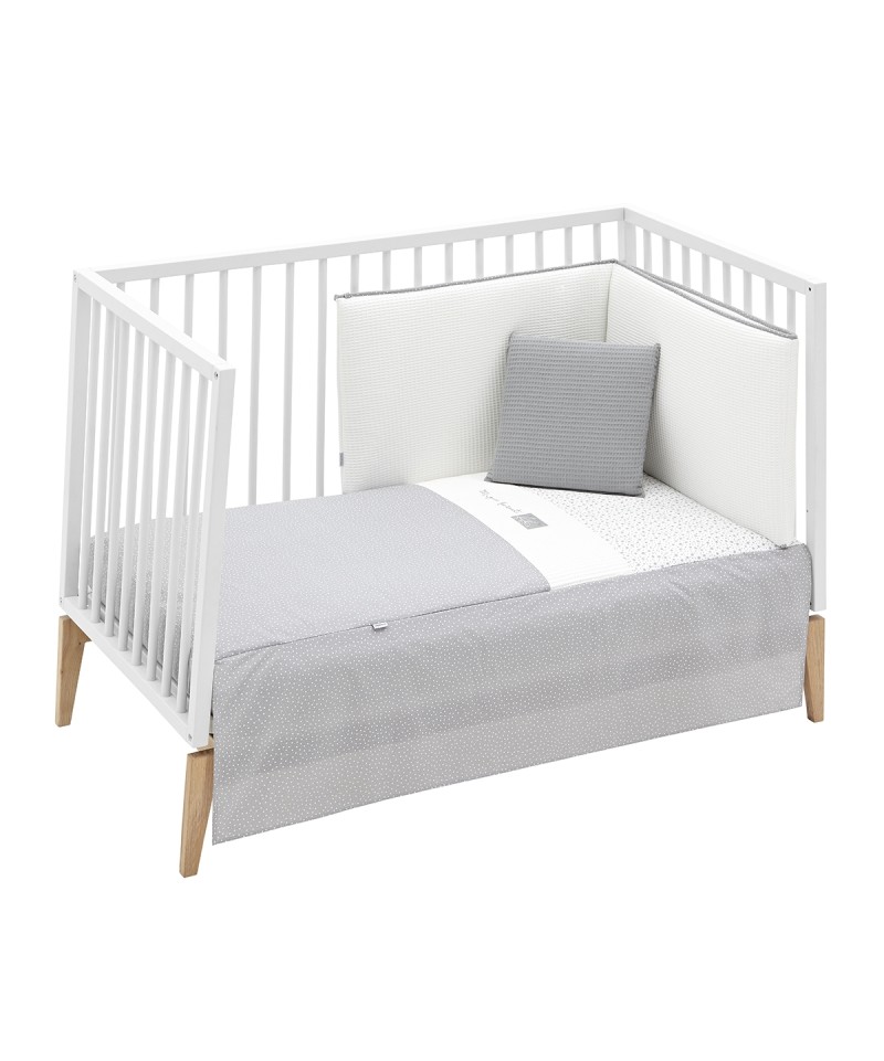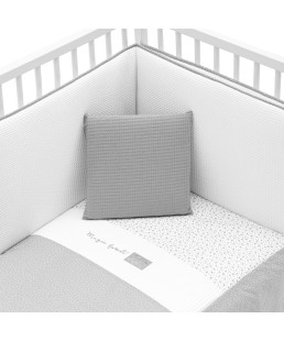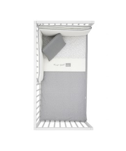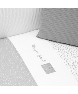 Juego de 2 piezas para vestir la cuna, compuesto por colcha más protector. La colcha, es la prenda que viste la cuna y cumple el cometido de protección contra el frío como si de una manta o una funda nórdica se tratara.