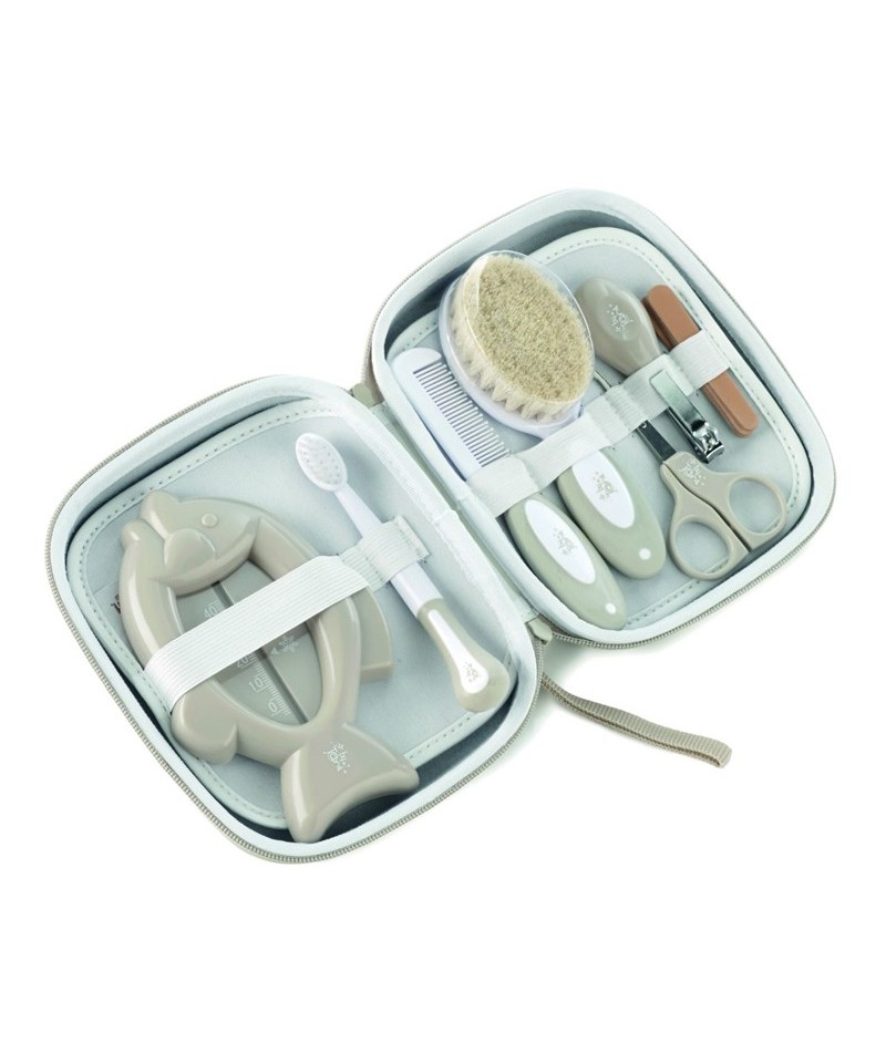 Compuesto por 1 cepillo, 1 peine, 1 cepillo de dientes, 1 tijeras de seguridad, 1 cortaúñas, 4 limas de uñas y 1 termómetro para medir la temperatura del agua.