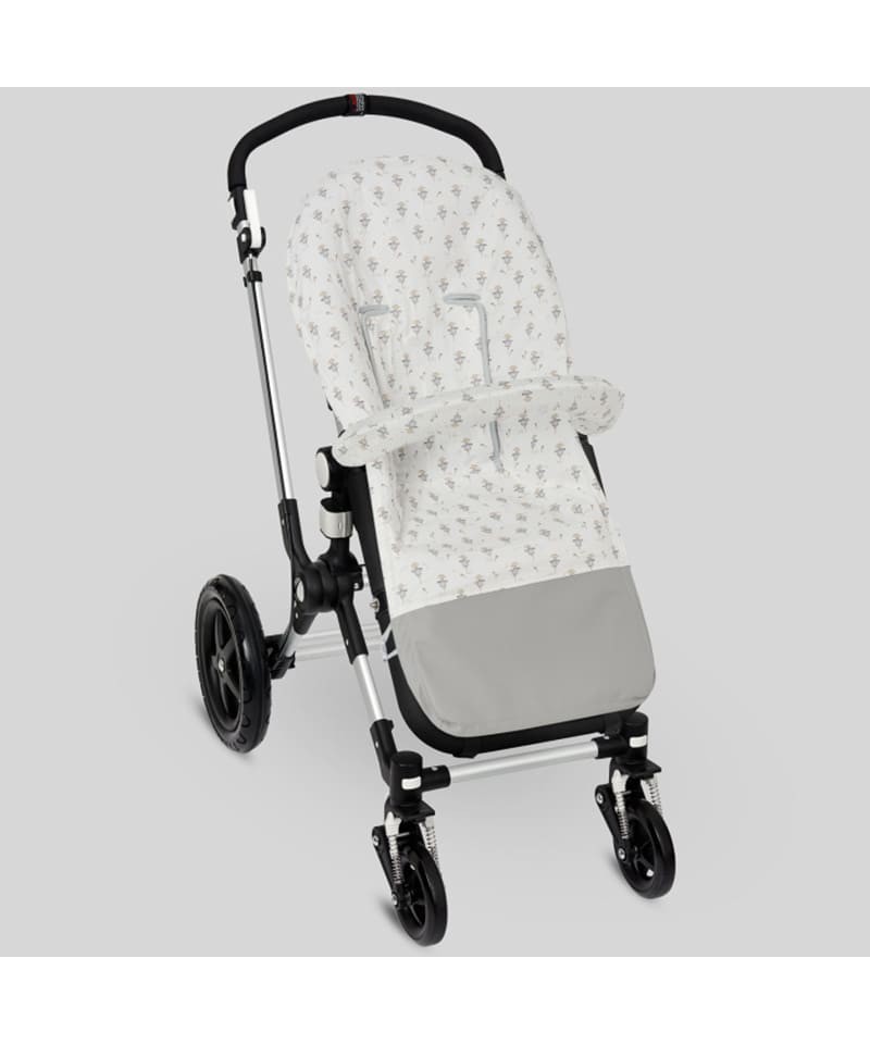 Colchoneta para sillas de paseo confecciona en tejido seersuker de algodón con estampado de espantapájaros. Cubre barra a juego y refuerzo de polipiel en los pies.