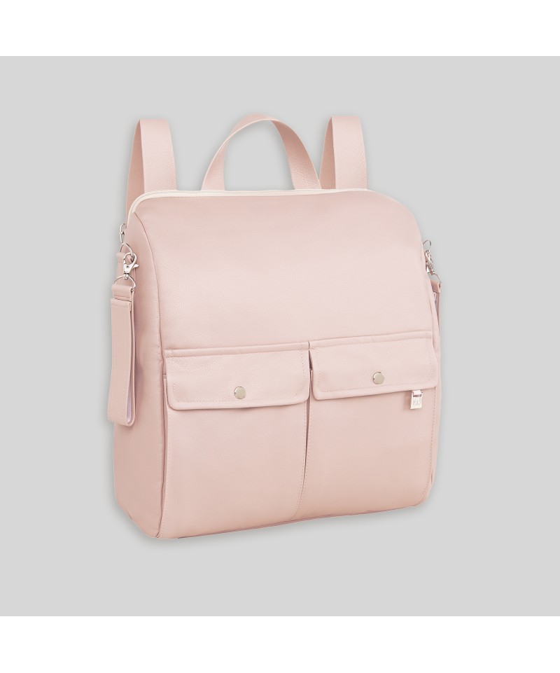 Amplia mochila de polipiel con dos bolsillos delanteros. Ideal para colgar en la silla del bebé o usar como mochila.