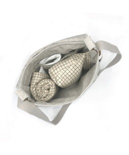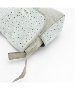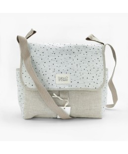Bolsa de medida compacta para poner todos los “trastos” de tu bebé a la hora de salir de paseo. Exterior en lino 100% beige con solapa y bolsillos laterales en estampado de algodón.