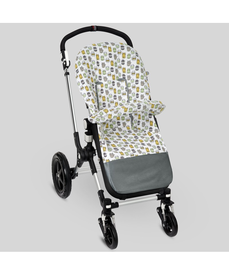 Colchoneta para sillas de paseo confeccionada en tejido popelín de algodón con estampado gatos. Cubre barra a juego y refuerzo de polipiel en los pies.